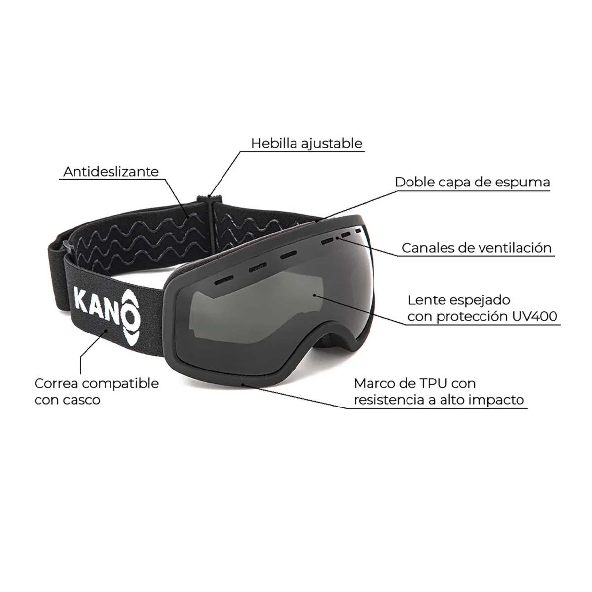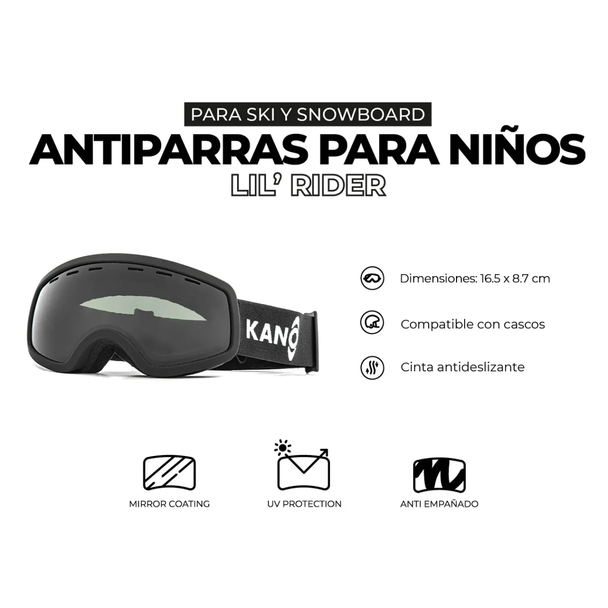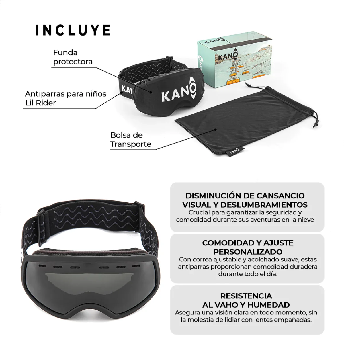 Las Gafas de Nieve Lil Rider by Kano están diseñadas para los más pequeños. Cubren los ojos por completo y se ajustan alrededor de la cabeza con una correa elástica ajustable con antideslizante. Posee una mica de 4600K lo que da una buena percepción del contraste y una reproducción de colores precisa en condiciones de luz diurna o mixta en la montaña. Además cuentan con coating anti-fog que evita que se empañen los cristales con la diferencia de temperaturas, tienen protección contra los rayos uv y sistema antireflejo.