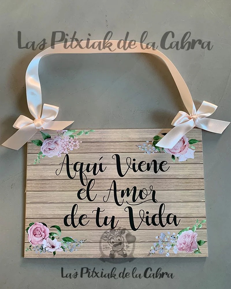 Los carteles de aquí viene la novia, se utilizan en la ceremonia para que los pajes o damitas anuncien la llegada de la novia, del novio o lleven alguna frase graciosa.