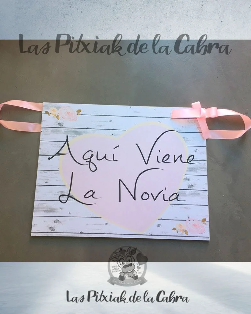 Los carteles de aquí viene la novia, se utilizan en la ceremonia para que los pajes o damitas anuncien la llegada de la novia, del novio o lleven alguna frase graciosa.