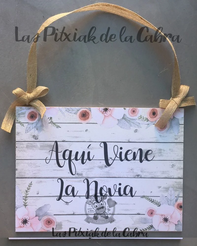 Los carteles de aquí viene la novia, se utilizan en la ceremonia para que los pajes o damitas anuncien la llegada de la novia, del novio o lleven alguna frase graciosa.