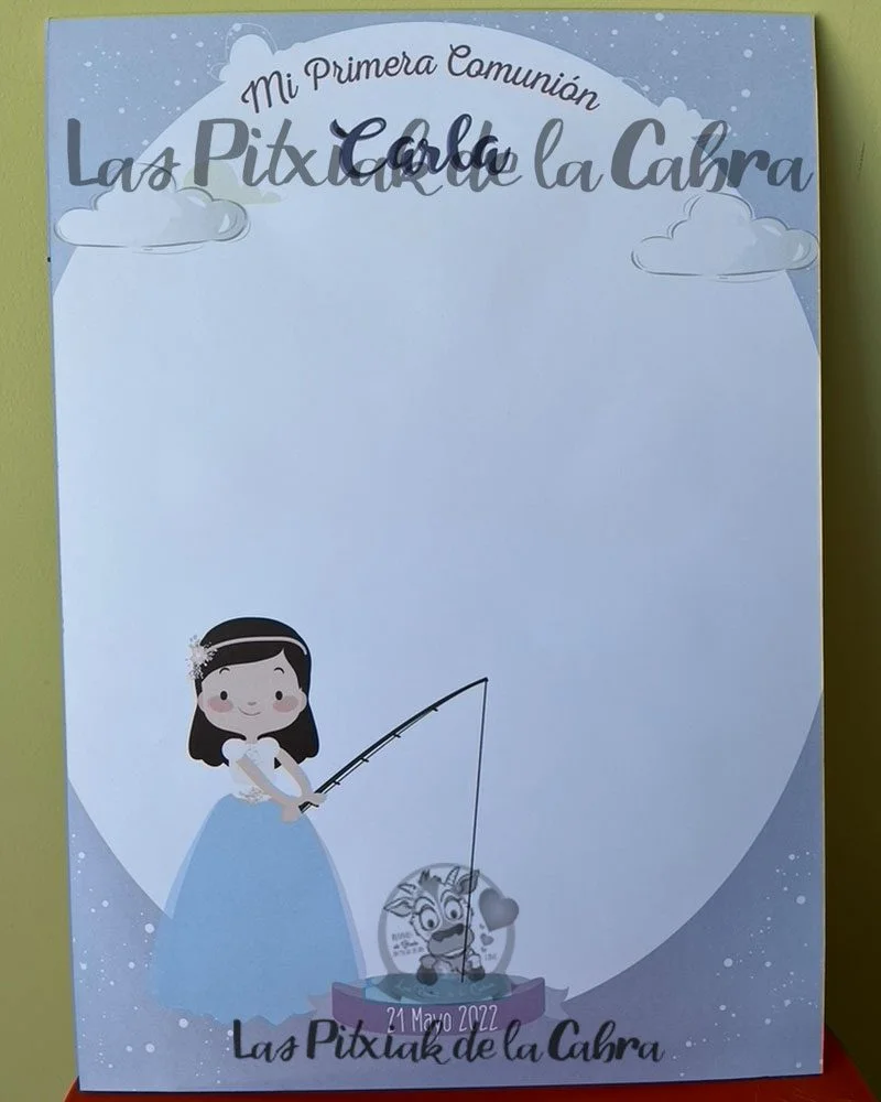 Por ejemplo este Árbol de Huellas Carla está hecho para esta niña que le gusta mucho la pesca y con el vestido de su comunión.