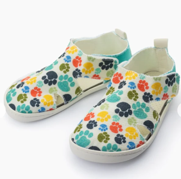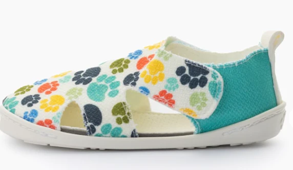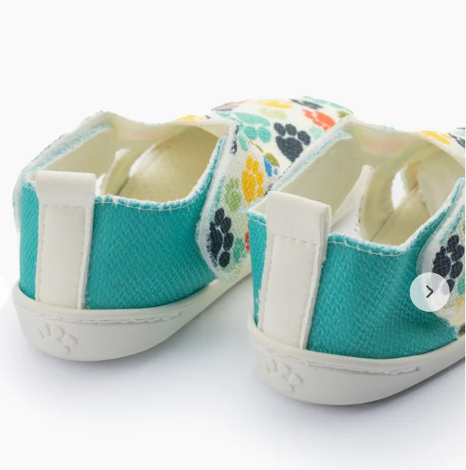 Color turquesa y tela decorada de huellas de colores en pala