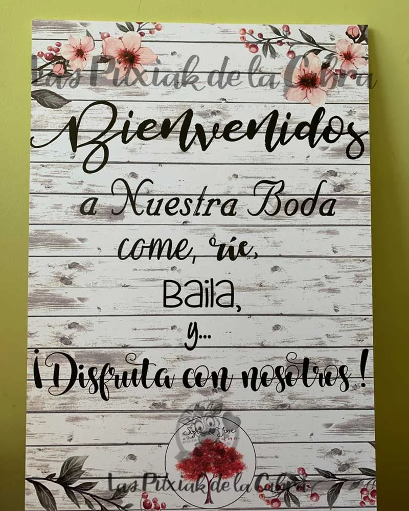 Como todos nuestros artículos, hacemos el diseño totalmente personalizado para los carteles de bienvenida. Todos nuestros artículos llevan un apartado de personalización en el que podéis escribir cualquier cosa que queráis modificar. Si os gusta este cartel pero queréis cambiarle el texto, añadir una foto vuestra, vuestro logo, o lo que se os ocurra, escribidlo en el apartado de personalización. Cualquier cosa que queráis que incluyamos, enviadla al mail del pedido.