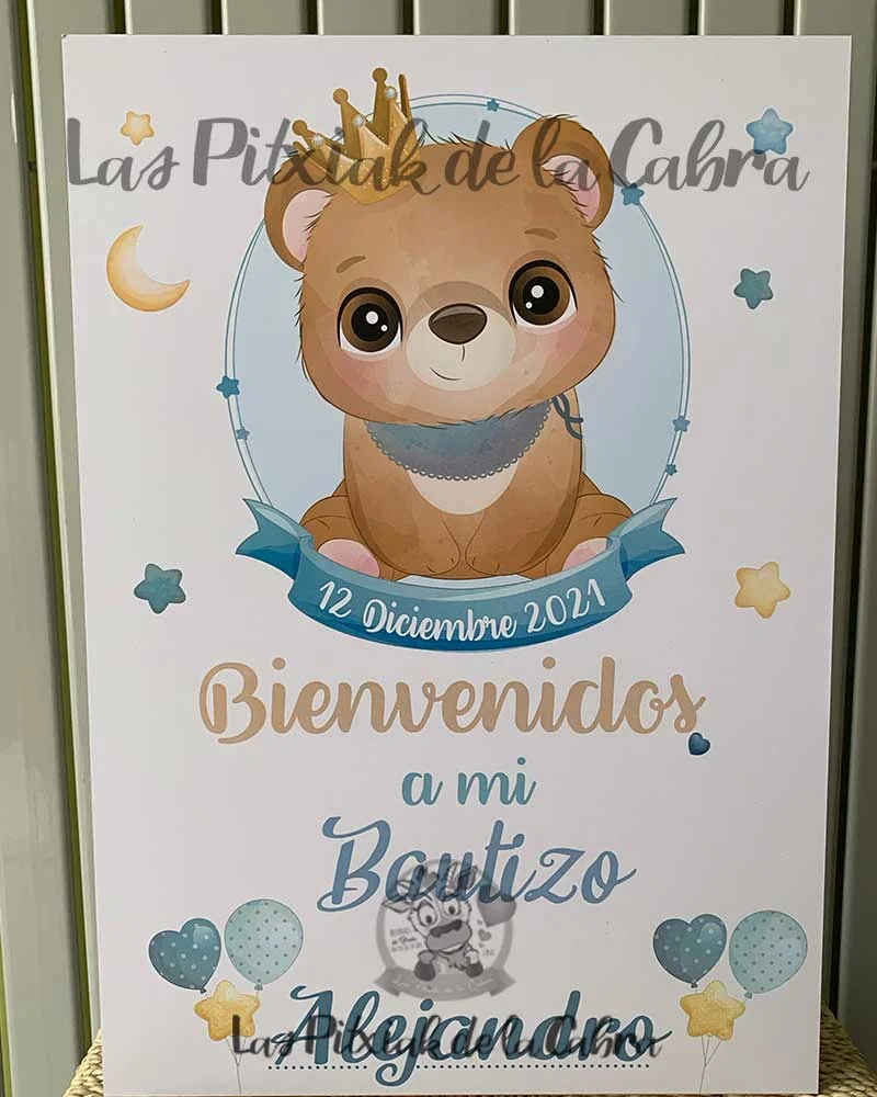 Para el Bautizo de Alejandro, su mamá, tenía muy claro que quería un cartel en tonos azules y con un estampado de un osito, le hicimos varias propuestas y finalmente este fue el cartel seleccionado por ella.