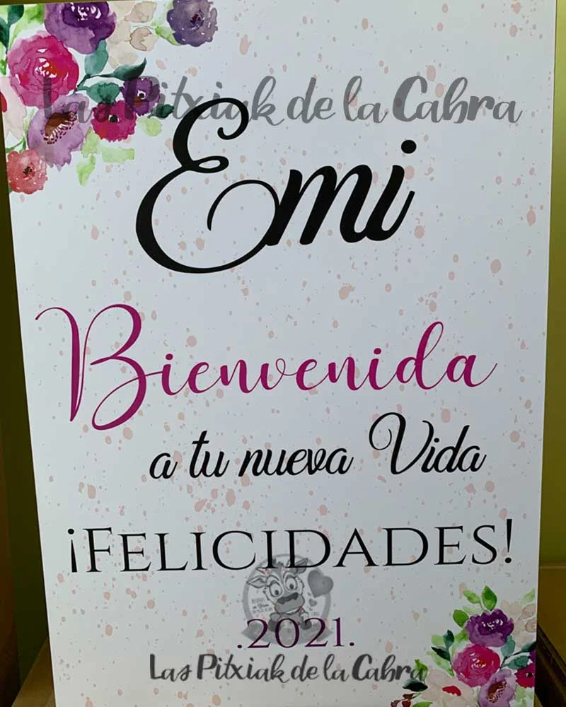 Como todos nuestros artículos, hacemos el diseño totalmente personalizado para los carteles de bienvenida. Todos nuestros artículos llevan un apartado de personalización en el que podéis escribir cualquier cosa que queráis modificar. Si os gusta este cartel pero queréis cambiarle el texto, añadir una foto vuestra, vuestro logo, escribidlo en el apartado de personalización. Cualquier cosa que queráis que incluyamos, enviadla al mail del pedido.