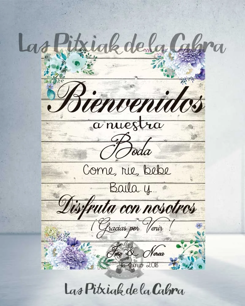 Como todos nuestros artículos, hacemos el diseño totalmente personalizado para los carteles de bienvenida. Todos nuestros artículos llevan un apartado de personalización en el que podéis escribir cualquier cosa que queráis modificar. Si os gusta este cartel pero queréis cambiarle el texto, añadir una foto vuestra, vuestro logo, o lo que se os ocurra, escribidlo en el apartado de personalización. Cualquier cosa que queráis que incluyamos, enviadla al mail del pedido.