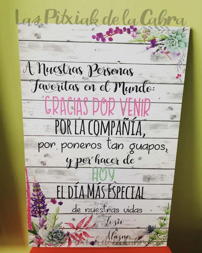 ¿Sabías que…? el Cartel Bienvenidos Josu & Alazne se llama así porque ellos fueron los primeros novios que lo pidieron, lo diseñamos específicamente para ellos. Lleno de las flores silvestres que Alazne eligió.