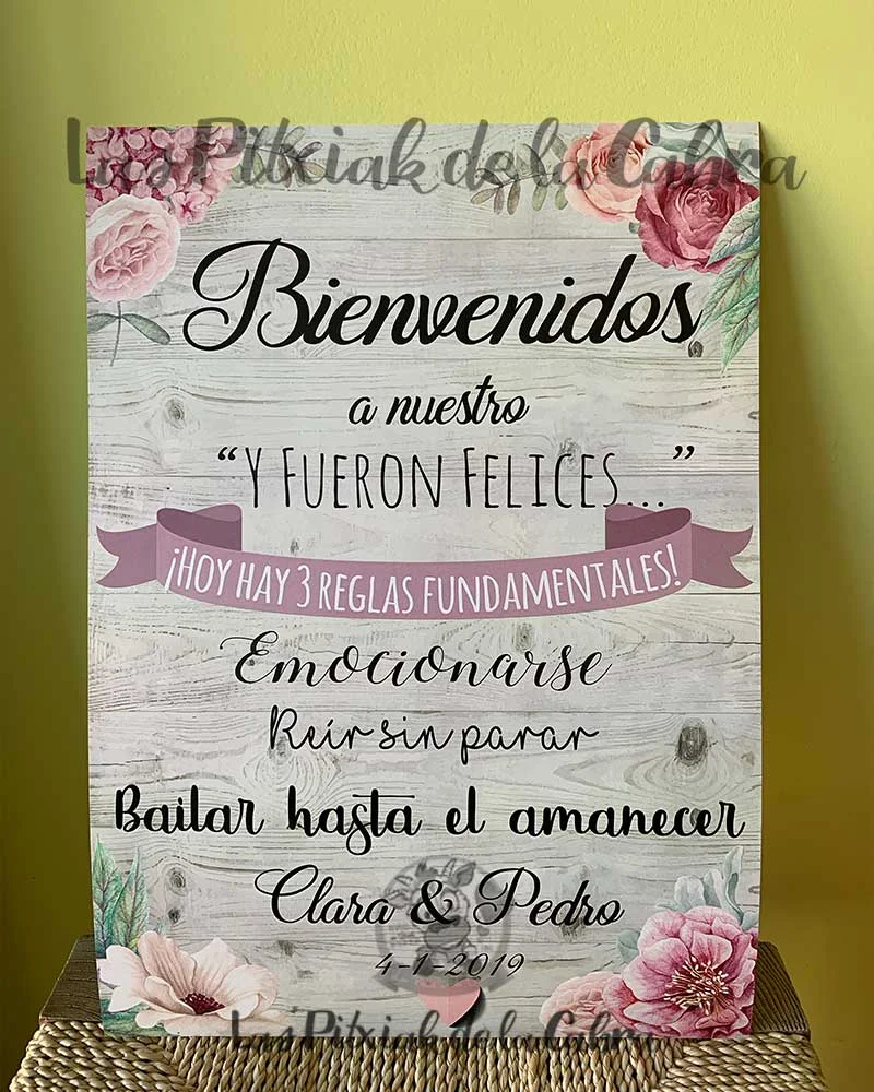 Como todos nuestros artículos, hacemos el diseño totalmente personalizado para los carteles de bienvenida. Todos nuestros artículos llevan un apartado de personalización en el que podéis escribir cualquier cosa que queráis modificar. Si os gusta este cartel pero queréis cambiarle el texto, añadir una foto vuestra, vuestro logo, o lo que se os ocurra, escribidlo en el apartado de personalización. Cualquier cosa que queráis que incluyamos, enviadla al mail del pedido.
