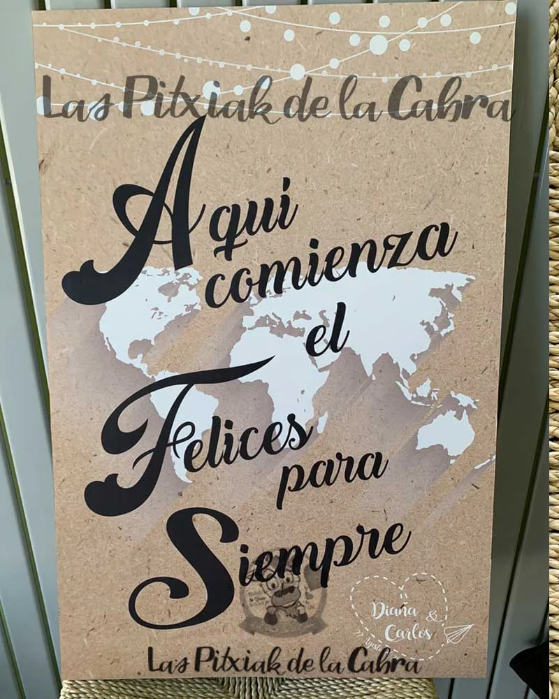 ¿Sabías que…? Boda Felices para Siempre cartel, en este cartel unimos un diseño estampado imitando a kraft, un mapa, y unas guirnaldas, tal y como nos pidieron los primeros novios para los que lo hicimos.