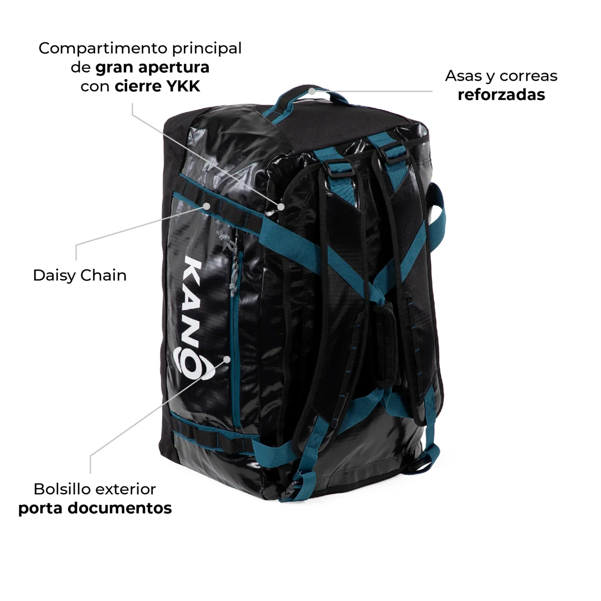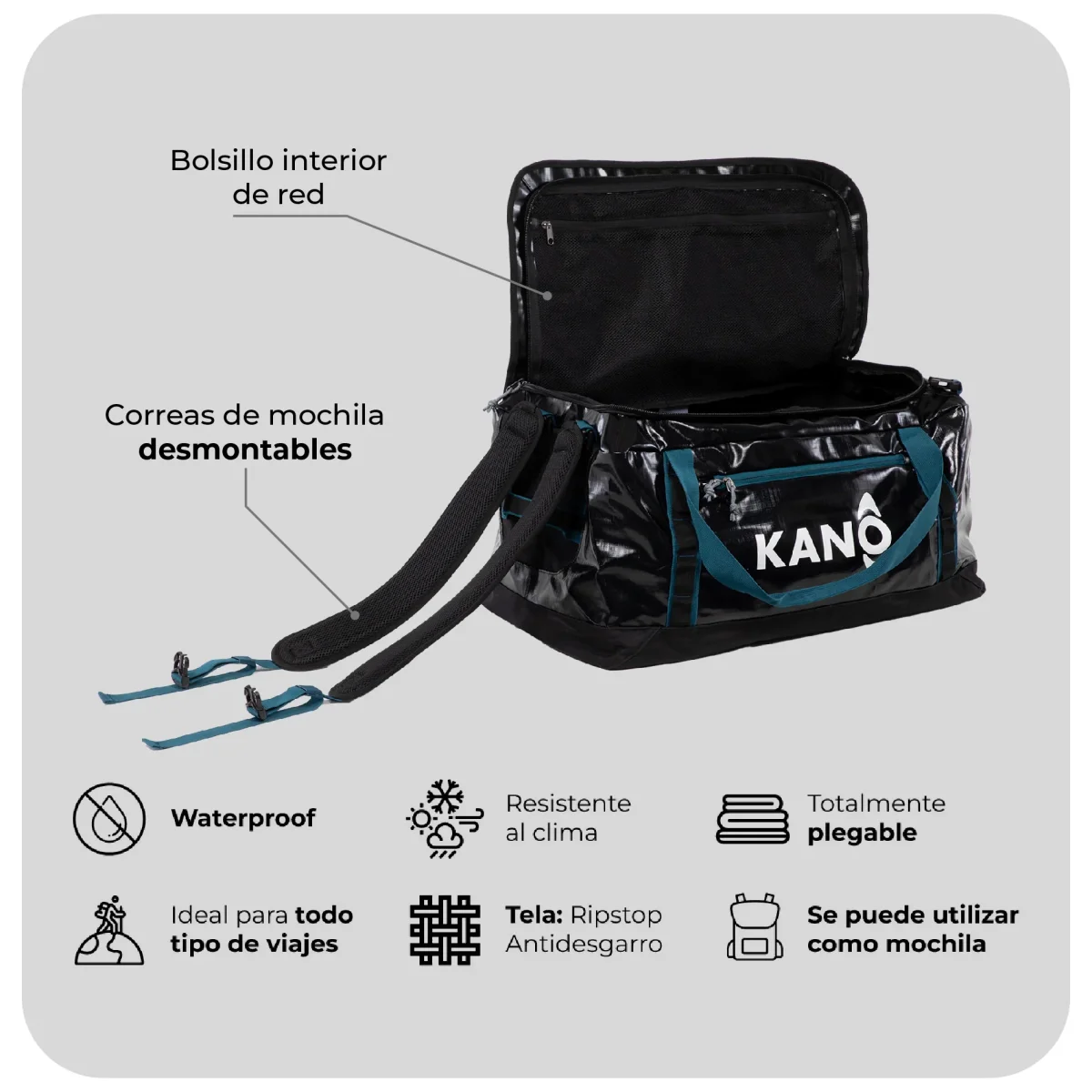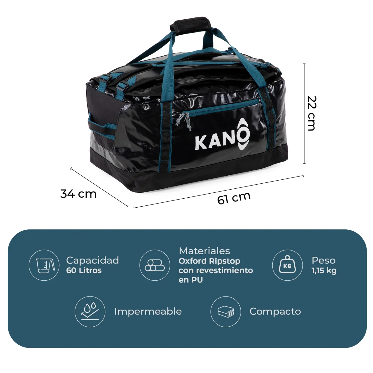 El Bolso Outdoor Impermeable de 60L by Kano es perfecto para acompañarte en tus viajes. Con un diseño multifuncional, podrás utilizar este bolso tanto como mochila como sosteniendolo por las asas de transporte. Además, cuenta con un sistema plegable con el que podrás trasladar el bolso vacío de una manera totalmente compacta dentro de su propio bolsillo exterior. Este bolso es un real caballito de batalla: tiene espacio tanto para un fin de semana de camping como para un viaje de varias semanas bien organizado.