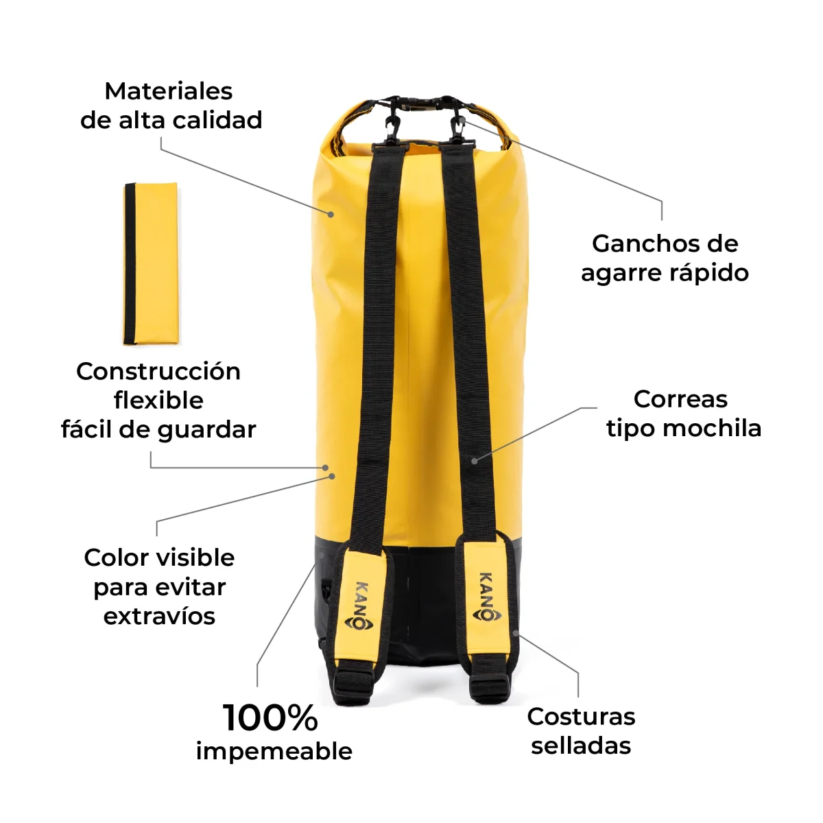 - Perfecto para mantener tus pertenencias secas mientras realizas deportes acuáticos o para trasladar tus prendas mojadas sin derramar agua.