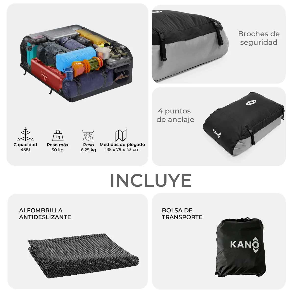 - Incluye una alfombrilla antideslizante para proteger el techo de tu automóvil