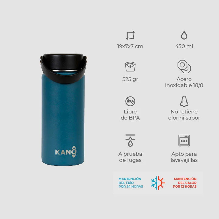 Cuando salgas de expedición no olvides llevar tu botella Kano. Te ayudará a mantener tus bebidas frías o calientes reteniendo su temperatura a lo largo del día, gracias a su aislamiento al vacío de doble pared de acero inoxidable. Además, su cuerpo interno de acero es resistente a las bacterias y malos olores.