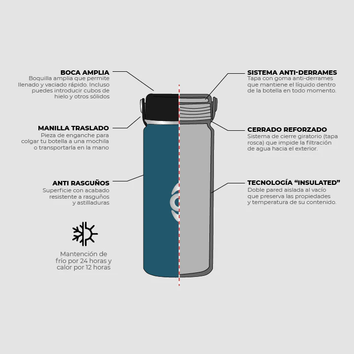 - Doble pared aislada al vacío que preserva las propiedades y temperatura de su contenido.