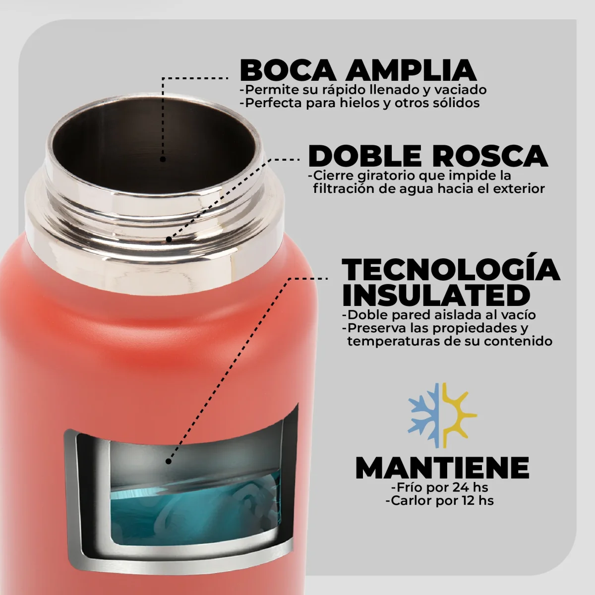- Doble pared aislada al vacío que preserva las propiedades y temperatura de su contenido.