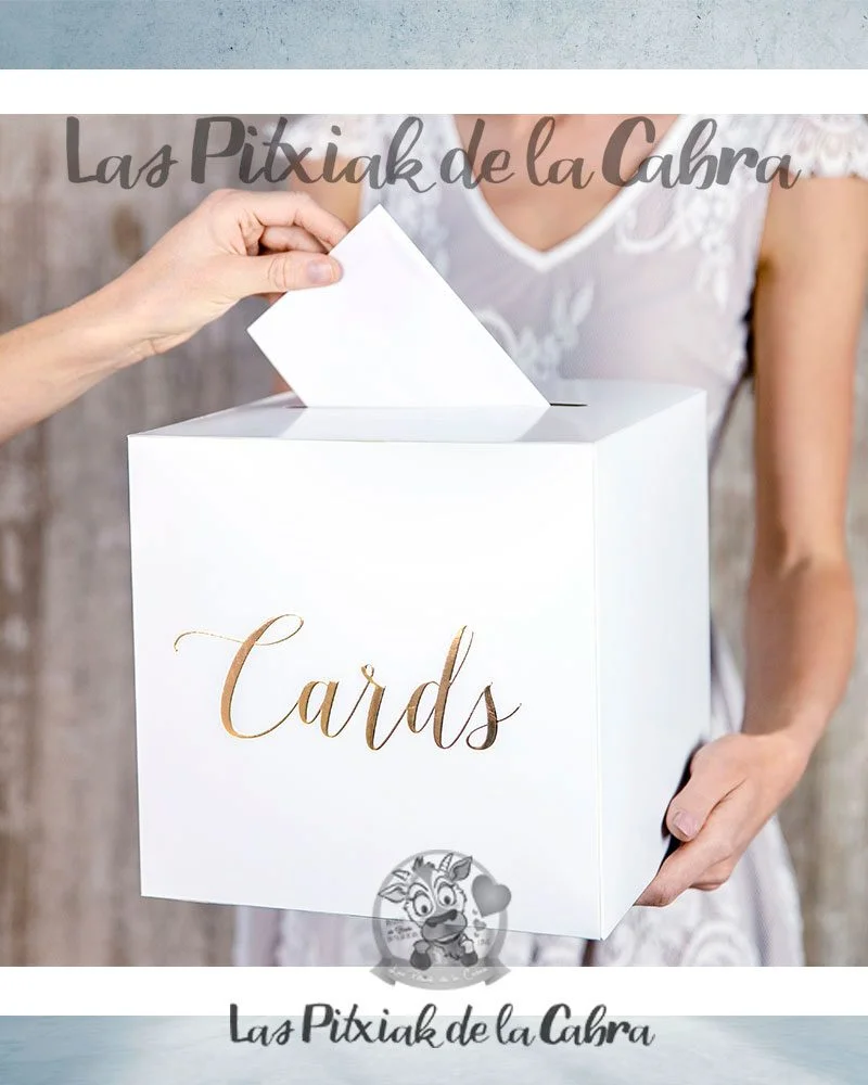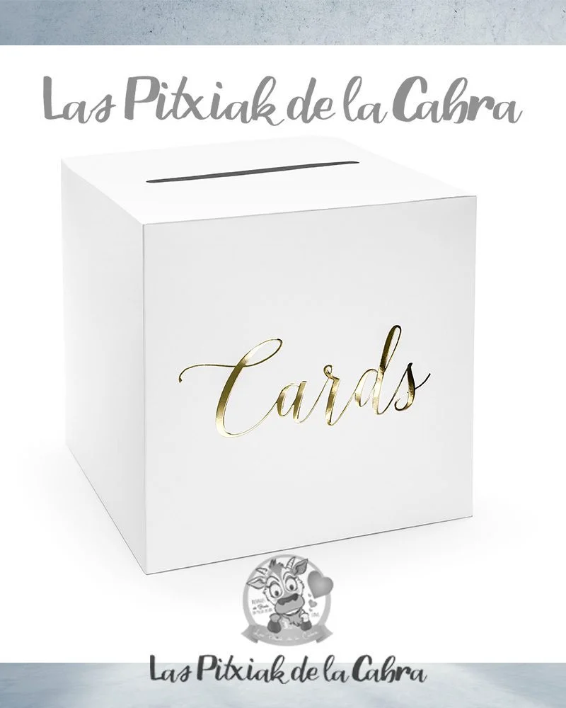 Esta caja elaborada en papel blanco destaca por su forma cúbica, con las letras ‘Cards’ en color dorado con efecto metalizado adornando una de sus caras. En su parte superior dispone de una ranura por donde deben introducirse las tarjetas con deseos.