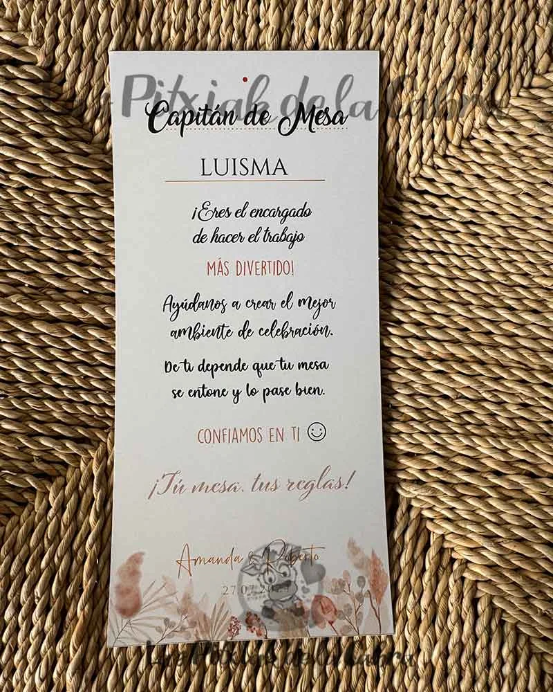 En este caso el cartel de capitán de mesa boho lleva un espacio en blanco en la parte superior para que escribáis a mano el nombre del invitado, en caso de que no lo tengáis claro todavía, pero si nos decís los nombres los enviaremos impresos. Y como todo lo demás que hacemos, aunque en la web veis modelos limitados, todo lo que soñéis, para vuestra boda, bautizo, comunión, cumpleaños o cualquier otro evento, nosotros lo haremos posible. Simplemente contadnos el diseño que queréis en el apartado de personalización.
