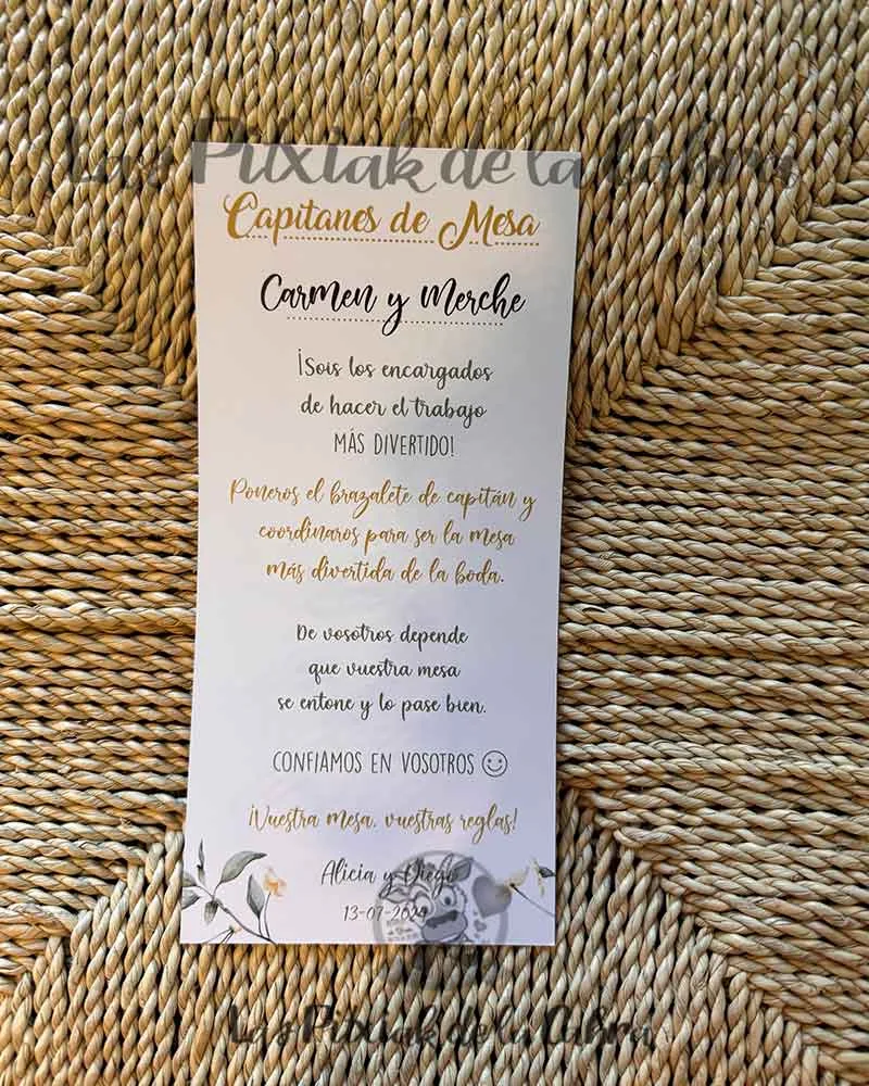 En este caso el cartel de capitán de mesa lleva un espacio en blanco en la parte superior para que escribáis a mano el nombre del invitado, en caso de que no lo tengáis claro todavía, pero si nos decís los nombres los enviaremos impresos. Y como todo lo demás que hacemos, aunque en la web veis modelos limitados, todo lo que soñéis, para vuestra boda, bautizo, comunión, cumpleaños o cualquier otro evento, nosotros lo haremos posible. Simplemente contadnos el diseño que queréis en el apartado de personalización.