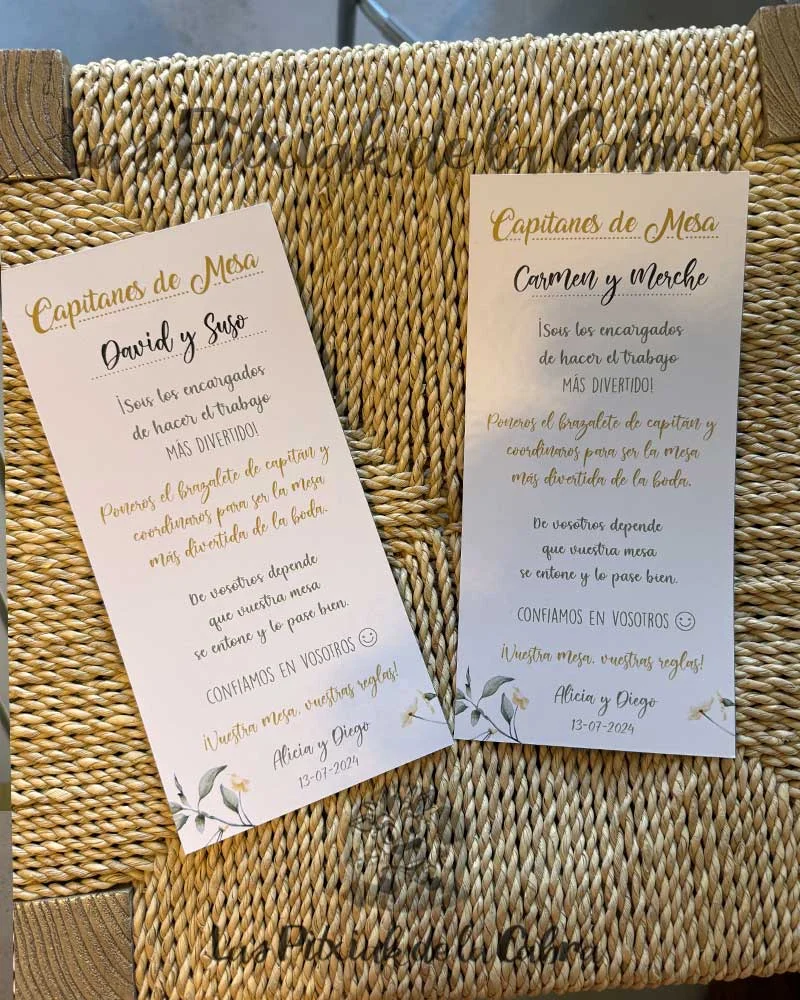 Últimamente se ha empezado a poner de moda los carteles de capitán de mesa, esto consiste en que tú nombras a alguno de los invitados en cada mesa para que animen la fiesta. Normalmente se puede poner en los centros de flores, en el lugar donde se siente el capitán de mesa o también hay quien lo coloca en alguna botella de chupito o vino en la mesa.