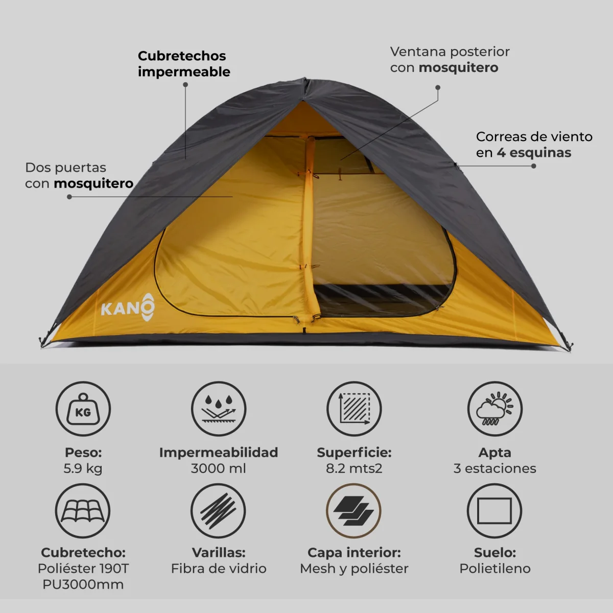 Descubre la Carpa para 6 Personas Calafquen by Kano, ideal para tus escapadas en la naturaleza. Con amplio espacio interior y fácil montaje, esta carpa familiar está diseñada para ofrecerte comodidad y protección en cualquier clima. Su diseño resistente al agua gracias a su columna de 3000mm, ventilación superior y materiales de alta calidad la convierten en la opción perfecta para acampadas en la montaña, el bosque o la playa. Ya sea para un viaje en familia o una aventura con amigos, esta carpa espaciosa garantiza una experiencia inolvidable.