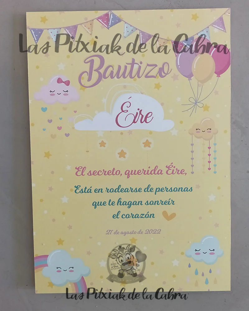 Cartel Bienvenida Bautizo Eire, es decir, que aunque en la web veis modelos limitados, todo lo que soñéis, para vuestra boda, bautizo, comunión, cumpleaños o cualquier otro evento, nosotros lo haremos posible.