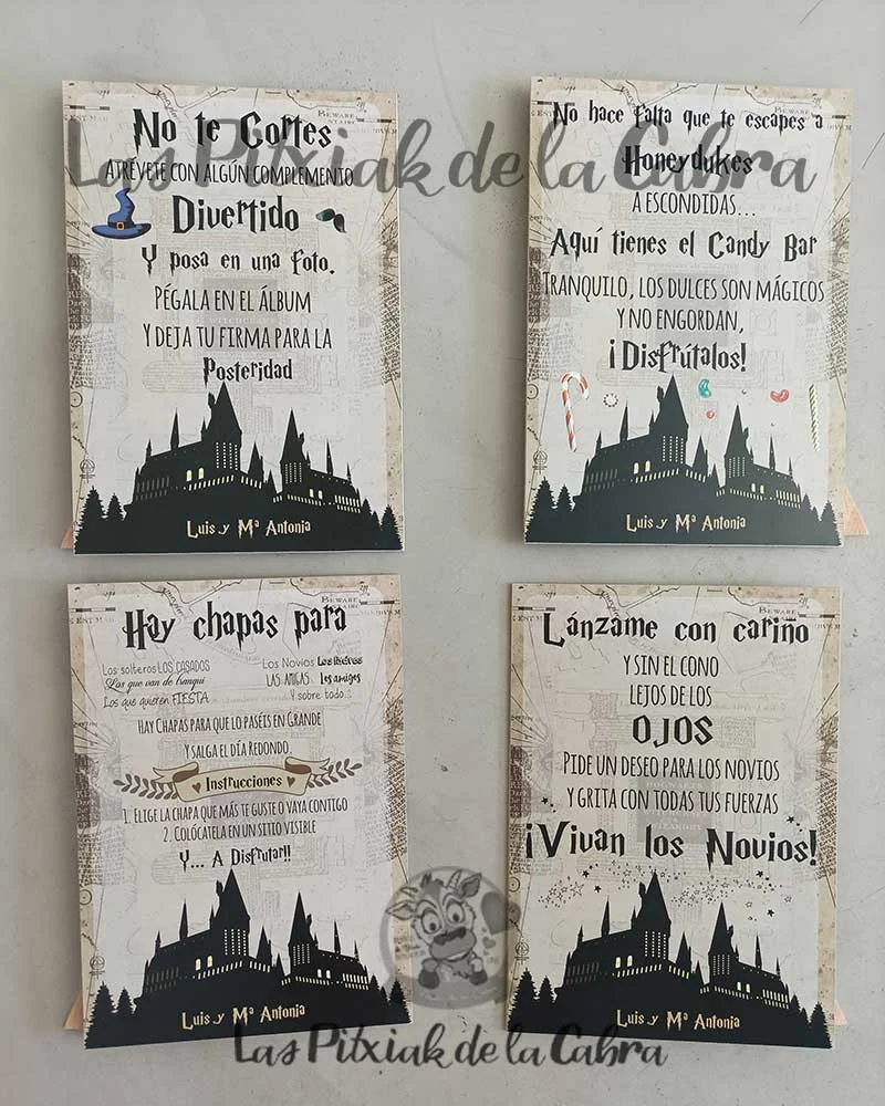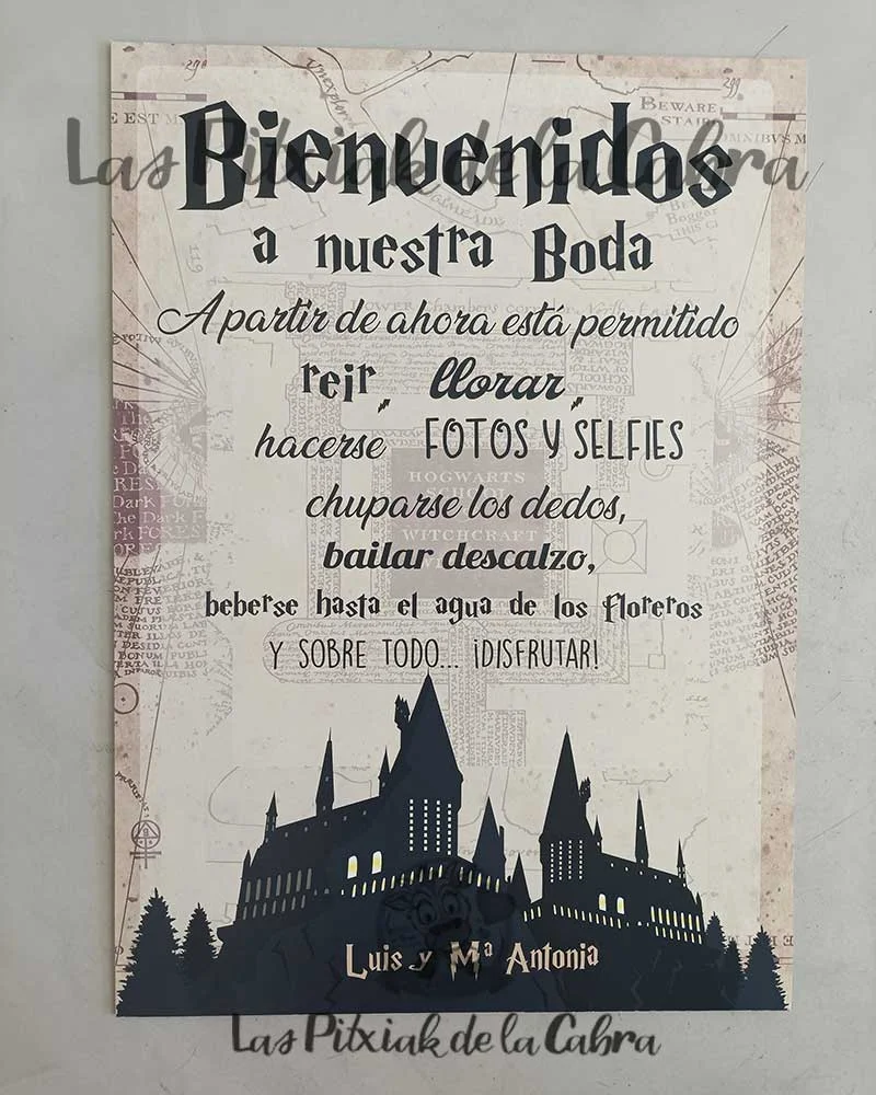 ¿Sabías que…? el Cartel Bienvenida Harry Potter lo diseñamos por primera vez para estos novios que nos encargaron a juego toda la cartelería para su boda.