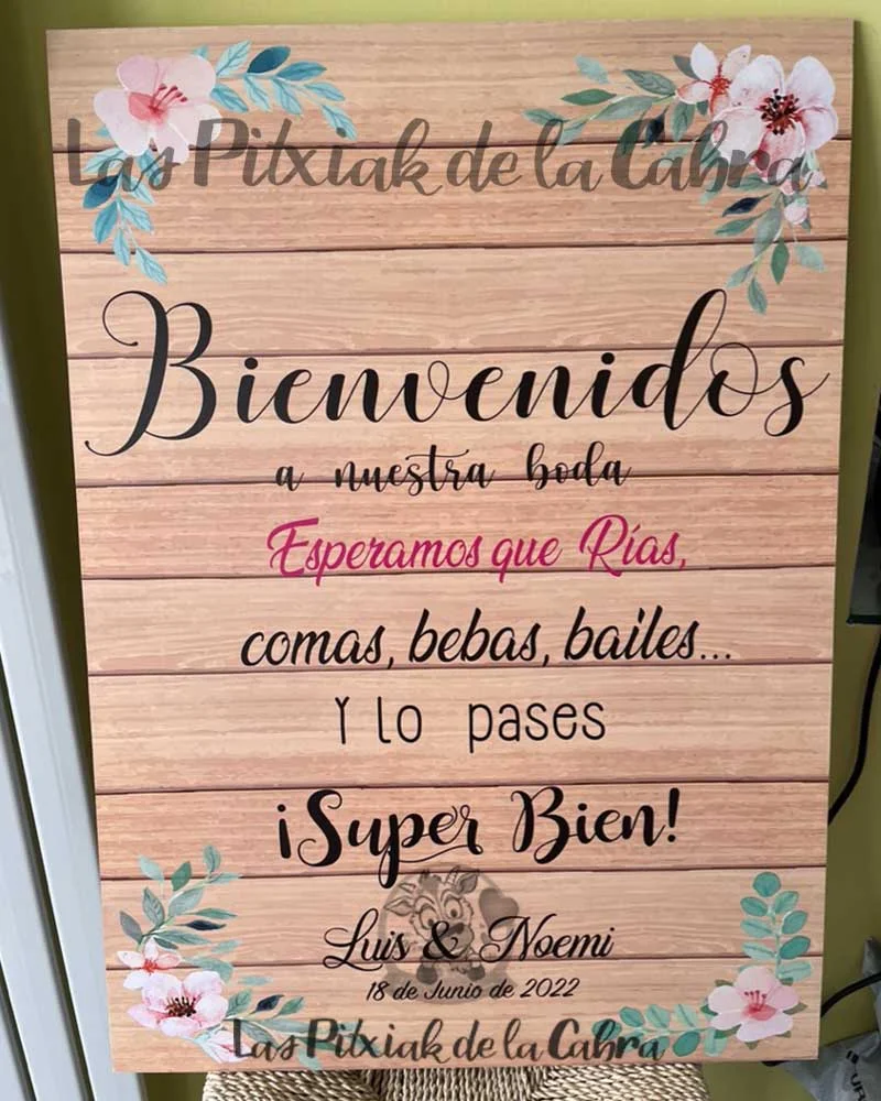 Como todos nuestros artículos, hacemos el diseño totalmente personalizado para los carteles de bienvenida. Todos nuestros artículos llevan un apartado de personalización en el que podéis escribir cualquier cosa que queráis modificar. Si os gusta este cartel pero queréis cambiarle el texto, añadir una foto vuestra, vuestro logo, o lo que se os ocurra, escribidlo en el apartado de personalización. Cualquier cosa que queráis que incluyamos, enviadla al mail del pedido.