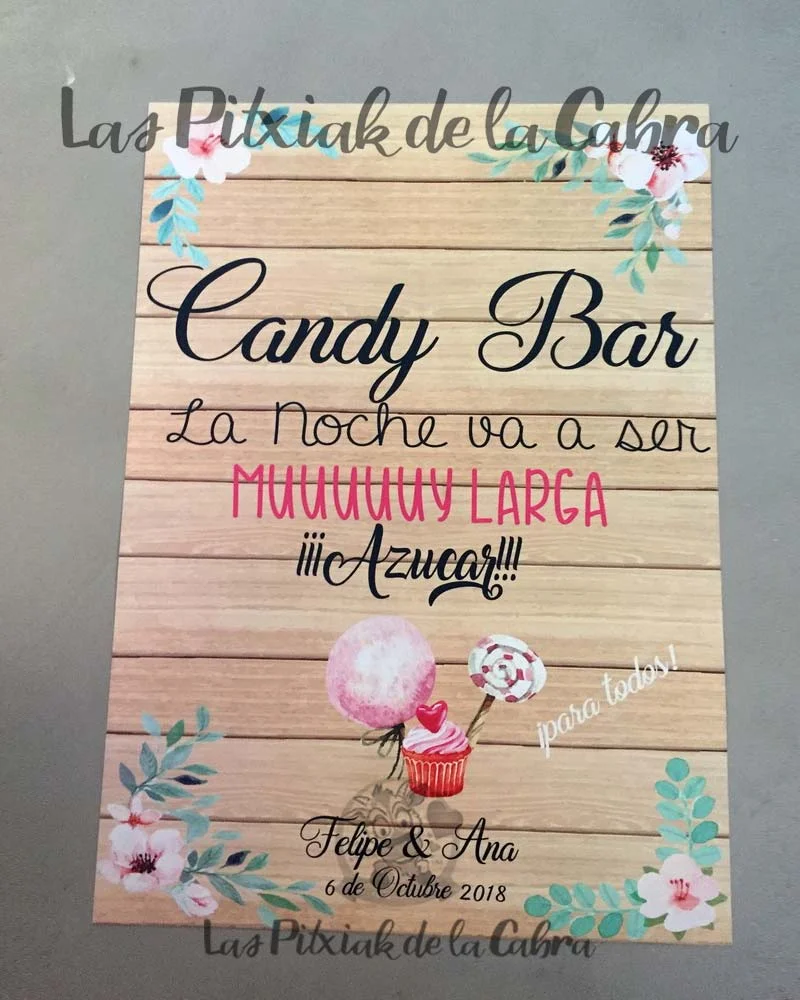 Cartel Estampado Madera Candy Bar podemos plasmar cualquier frase, cualquier idea, como esta que tuvo Garazi.