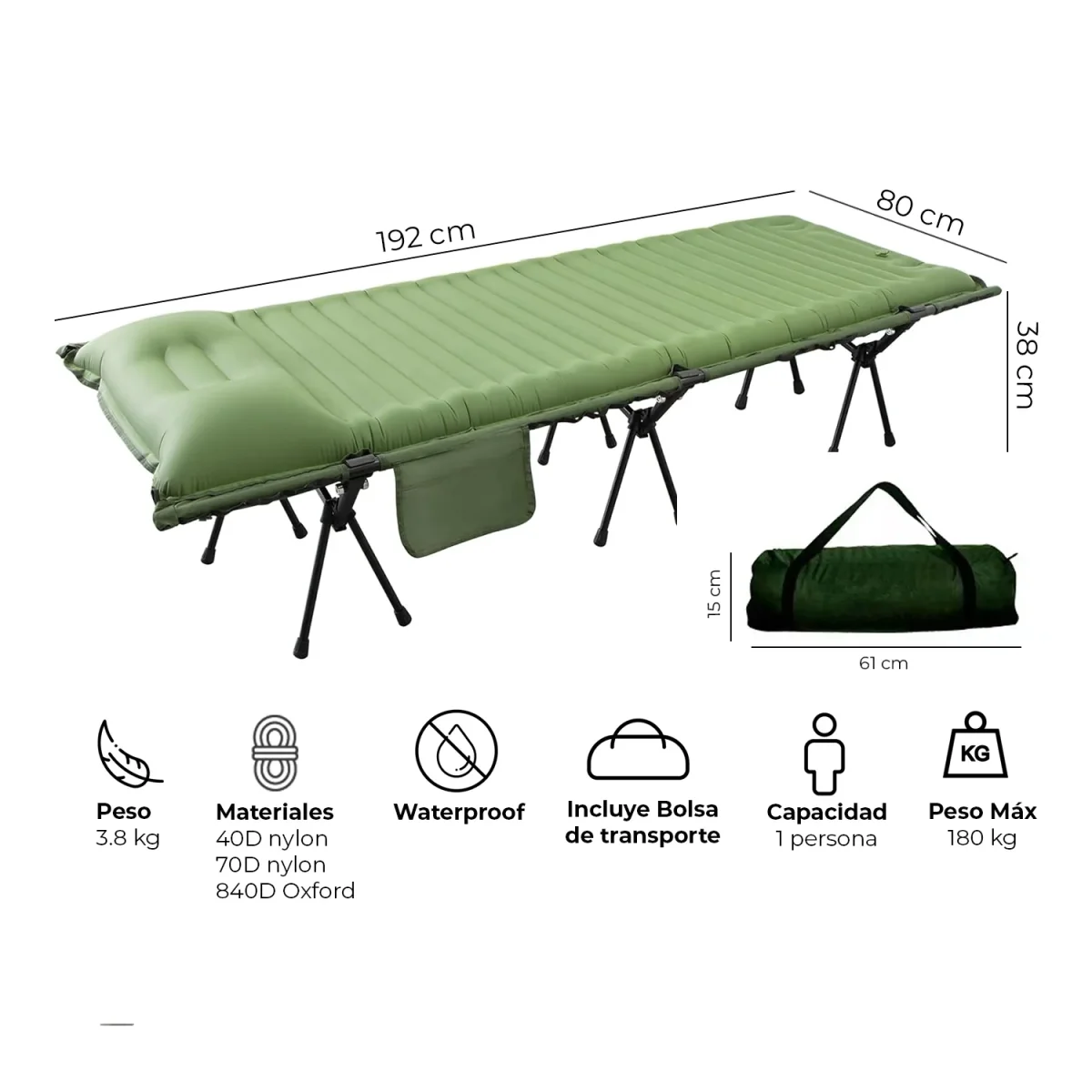 • Materiales de la estructura: 40D nylon + 70D nylon + 840D tela Oxford