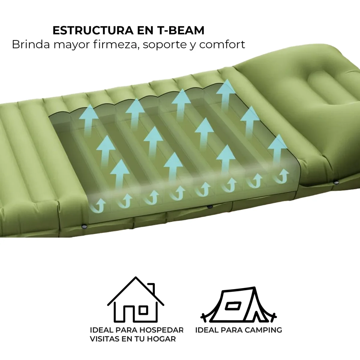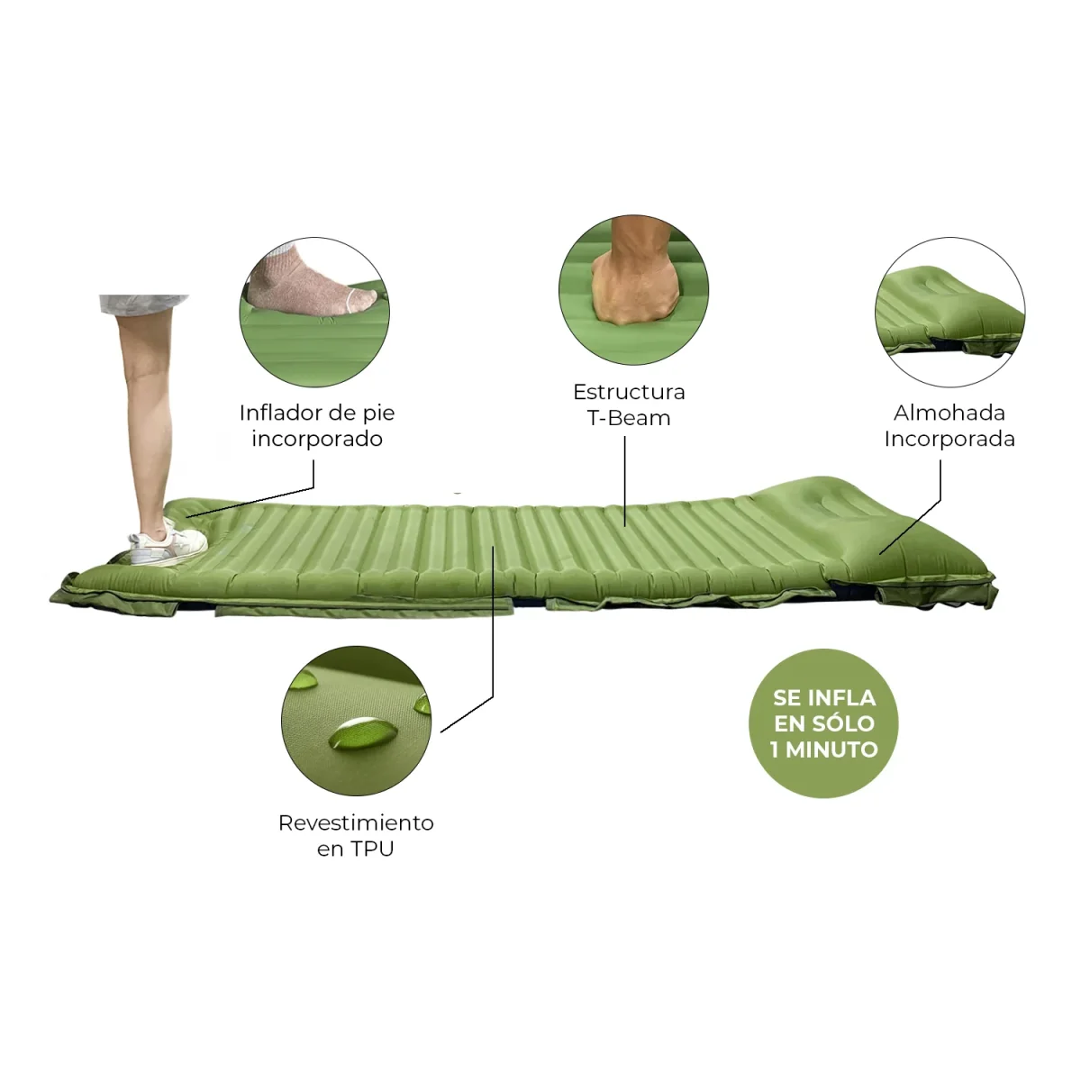 • Bomba de pie incorporada en la estructura del colchón: Se puede inflar presionando con el pie en 1 minuto