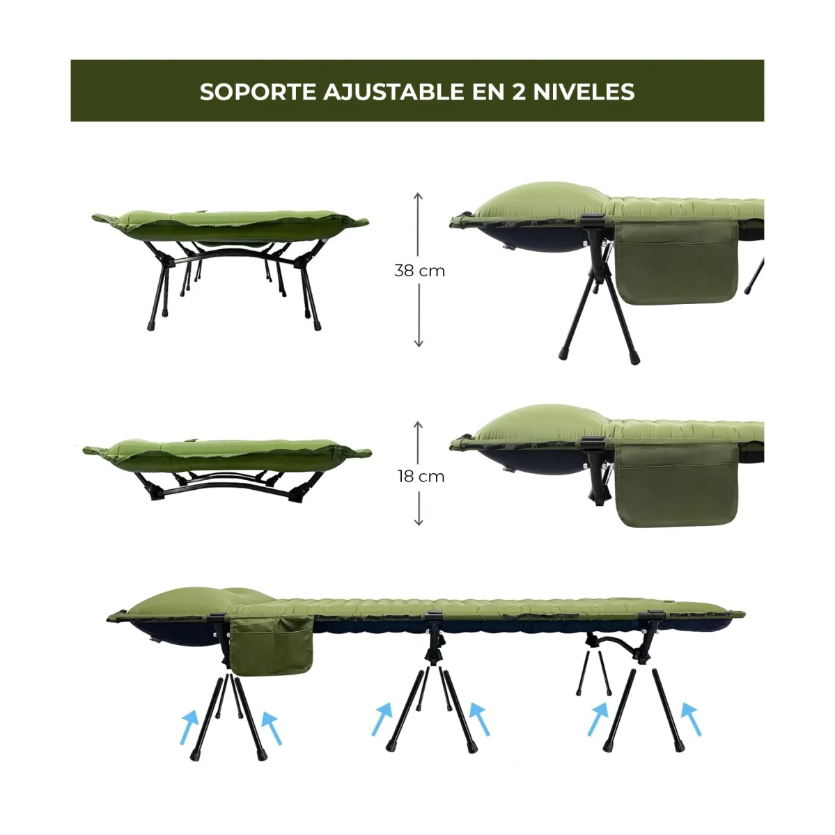 El catre cuenta con un colchón inflable waterproof que puedes inflar con su bomba integrada en 1 minuto, sólo tienes que presionar con el pie hasta inflarlo. Una vez inflado, puedes adjuntarle la base de altura regulable o usarlo sólo como colchón. Gracias a la base puedes elevarte del suelo, lo que te permite estar a resguardo de la humedad, la tierra y los insectos durante tu descanso.