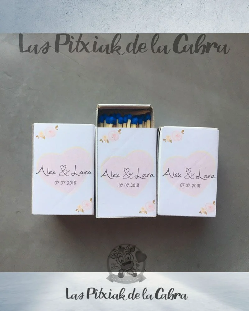 Las cajitas de Cerillas son pequeñas, llevan unos 40 fósforos aproximadamente y llevan una pegatina en cada cara, pueden ser iguales o diferentes. ¡Como vosotros queráis!