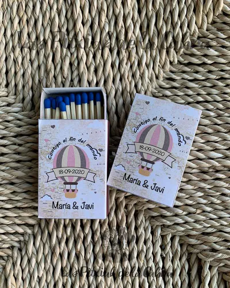 Las cajitas de Cerillas son pequeñas, llevan unos 40 fósforos aproximadamente y llevan una pegatina en cada cara, pueden ser iguales o diferentes. ¡Como vosotros queráis!