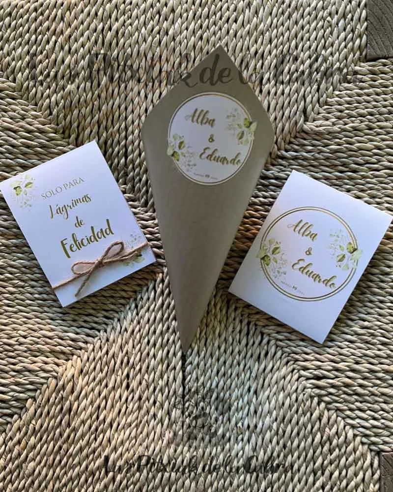 Los conos para pétalos son conos grandes de aproximadamente unos 20 cm. y van impresos en papel de 300 gramos a una sola cara. Los enviamos completamente montados, listos para colocar donde queráis ponerlos. Los conos son ideales para llenar de pétalos para tirar en la ceremonia, pero también podéis llenarlos de confeti, arroz o para pueden valer para vuestra mesa dulce.