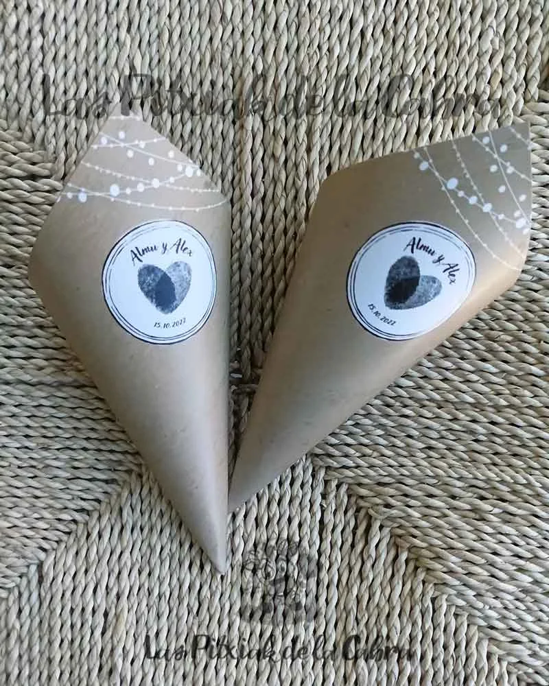 Los conos para pétalos son conos grandes de aproximadamente unos 20 cm. y van impresos en papel de 300 gramos a una sola cara. Los enviamos completamente montados, listos para colocar donde queráis ponerlos. Los conos son ideales para llenar de pétalos para tirar en la ceremonia, pero también podéis llenarlos de confeti, arroz o para pueden valer para vuestra mesa dulce.