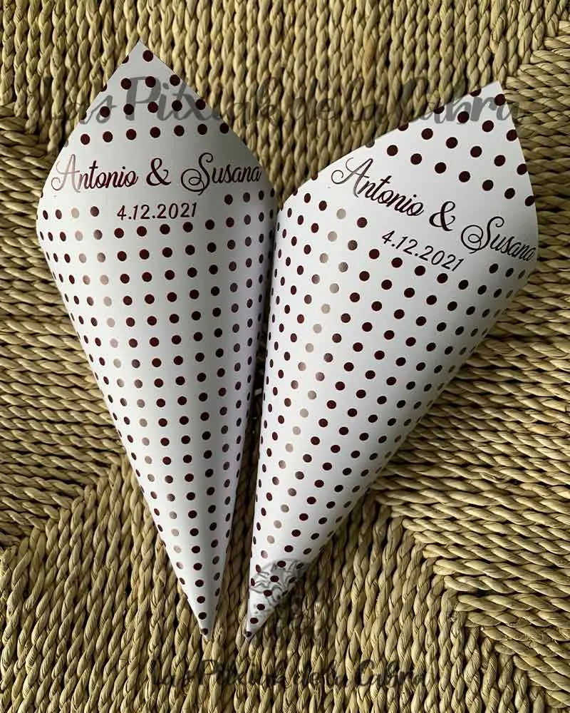 Los conos para pétalos son conos grandes de aproximadamente unos 20 cm. y van impresos en papel de 300 gramos. Los enviamos completamente montados, listos para colocar donde queráis ponerlos. Los conos son ideales para llenar de pétalos para tirar en la ceremonia, pero también podéis llenarlos de confeti, arroz o para pueden valer para vuestra mesa dulce.