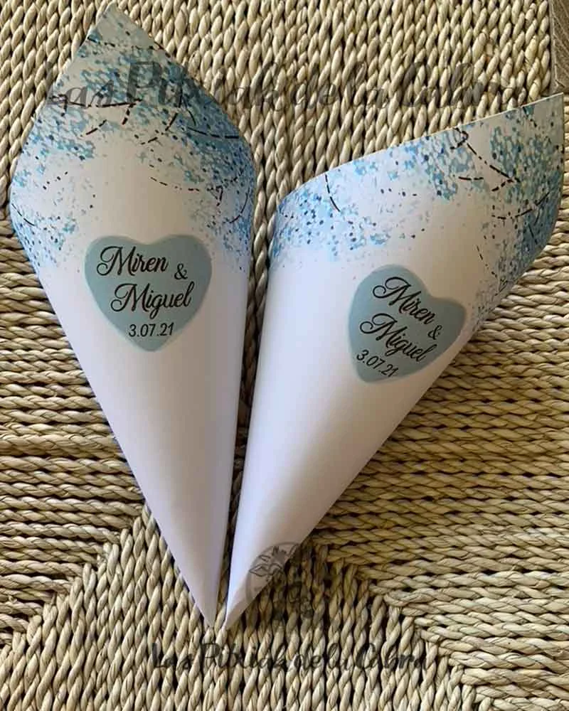Los conos para pétalos son conos grandes de aproximadamente unos 20 cm. y van impresos en papel de 300 gramos a una sola cara. Los enviamos completamente montados, listos para colocar donde queráis ponerlos. Los conos son ideales para llenar de pétalos para tirar en la ceremonia, pero también podéis llenarlos de confeti, arroz o para pueden valer para vuestra mesa dulce.