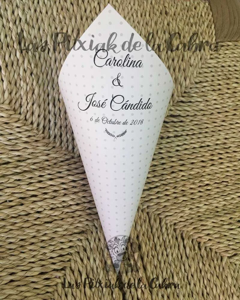 Los conos para pétalos son conos grandes de aproximadamente unos 20 cm. y van impresos en papel de 300 gramos a una sola cara. Los enviamos completamente montados, listos para colocar donde queráis ponerlos. Los conos son ideales para llenar de pétalos para tirar en la ceremonia, pero también podéis llenarlos de confeti, arroz o para pueden valer para vuestra mesa dulce.