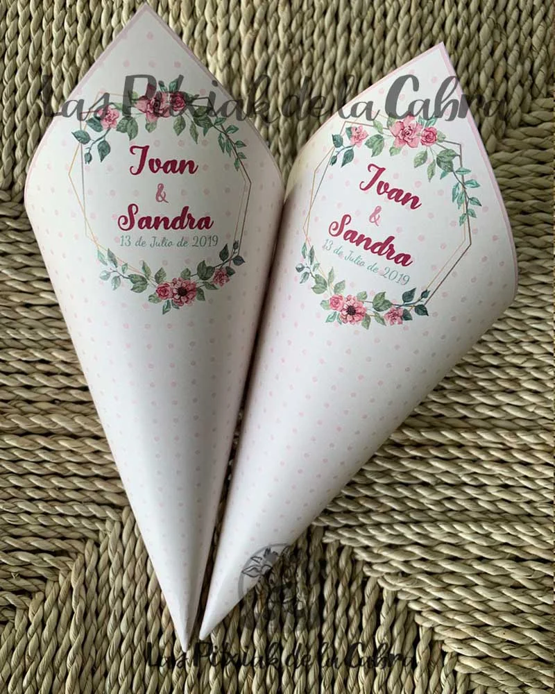 Los conos para pétalos son conos grandes de aproximadamente unos 20 cm. y van impresos en papel de 300 gramos. Los enviamos completamente montados, listos para colocar donde queráis ponerlos. Los conos son ideales para llenar de pétalos para tirar en la ceremonia, pero también podéis llenarlos de confeti, arroz o para pueden valer para vuestra mesa dulce.