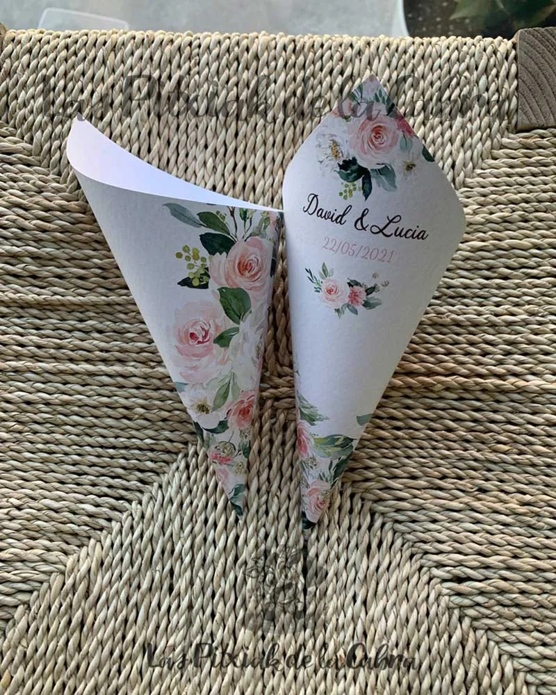Los conos para pétalos son conos grandes de aproximadamente unos 20 cm. y van impresos en papel de 300 gramos. Los enviamos completamente montados, listos para colocar donde queráis ponerlos. Los conos son ideales para llenar de pétalos para tirar en la ceremonia, pero también podéis llenarlos de confeti, arroz o para pueden valer para vuestra mesa dulce.