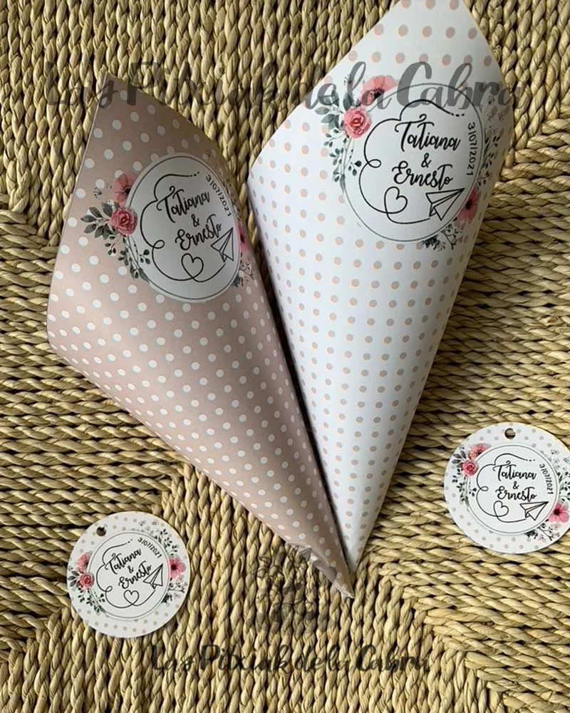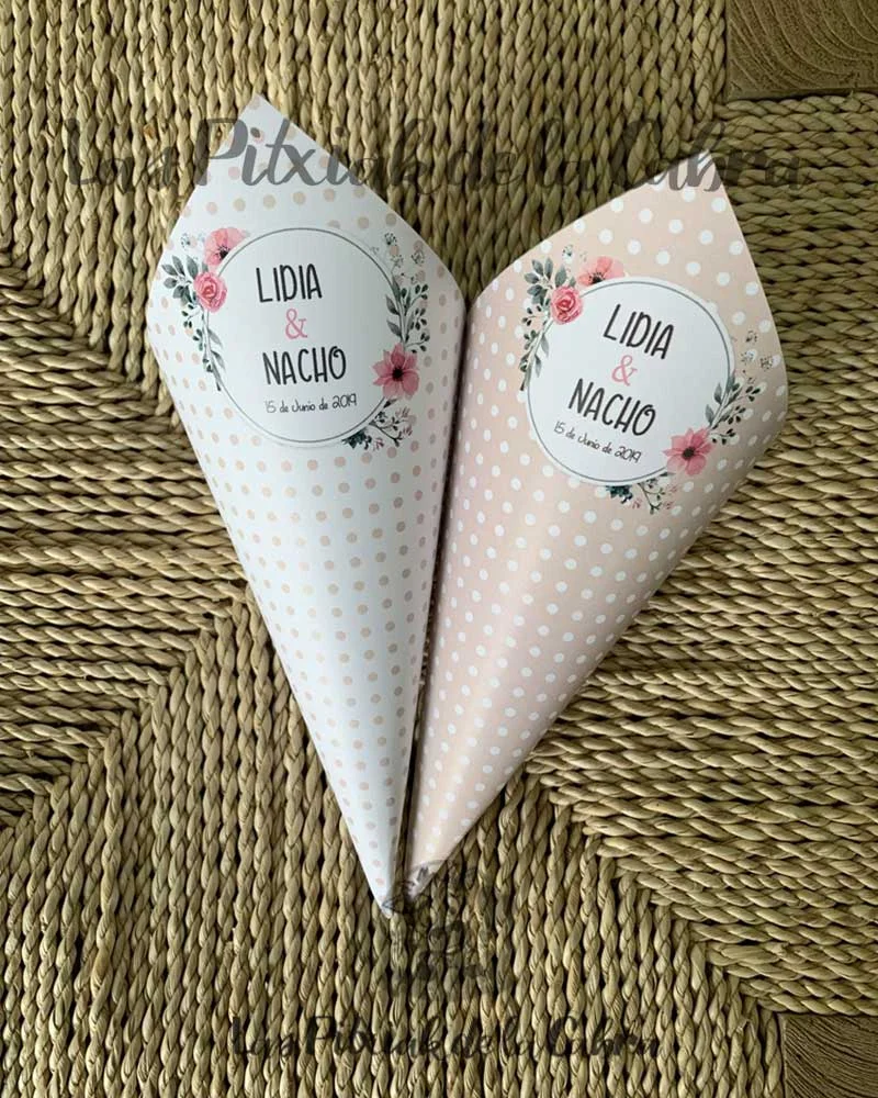 Los conos para pétalos son conos grandes de aproximadamente unos 20 cm. y van impresos en papel de 300 gramos. Los enviamos completamente montados, listos para colocar donde queráis ponerlos. Los conos son ideales para llenar de pétalos para tirar en la ceremonia, pero también podéis llenarlos de confeti, arroz o para pueden valer para vuestra mesa dulce.
