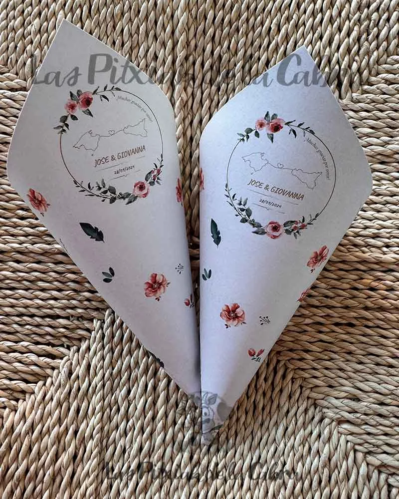 Los conos para pétalos son conos grandes de aproximadamente unos 20 cm. y van impresos en papel de 300 gramos a una sola cara. Los enviamos completamente montados, listos para colocar donde queráis ponerlos. Los conos son ideales para llenar de pétalos para tirar en la ceremonia, pero también podéis llenarlos de confeti, arroz o para pueden valer para vuestra mesa dulce.