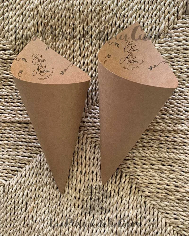 Los conos para pétalos son conos grandes de aproximadamente unos 20 cm. y van impresos en papel de 150 gramos. Ojo los conos Kraft, son má finitos que los que hacemos normalmente. Los enviamos completamente montados, listos para colocar donde queráis ponerlos. Los conos son ideales para llenar de pétalos para tirar en la ceremonia, pero también podéis llenarlos de confeti, arroz o para pueden valer para vuestra mesa dulce.