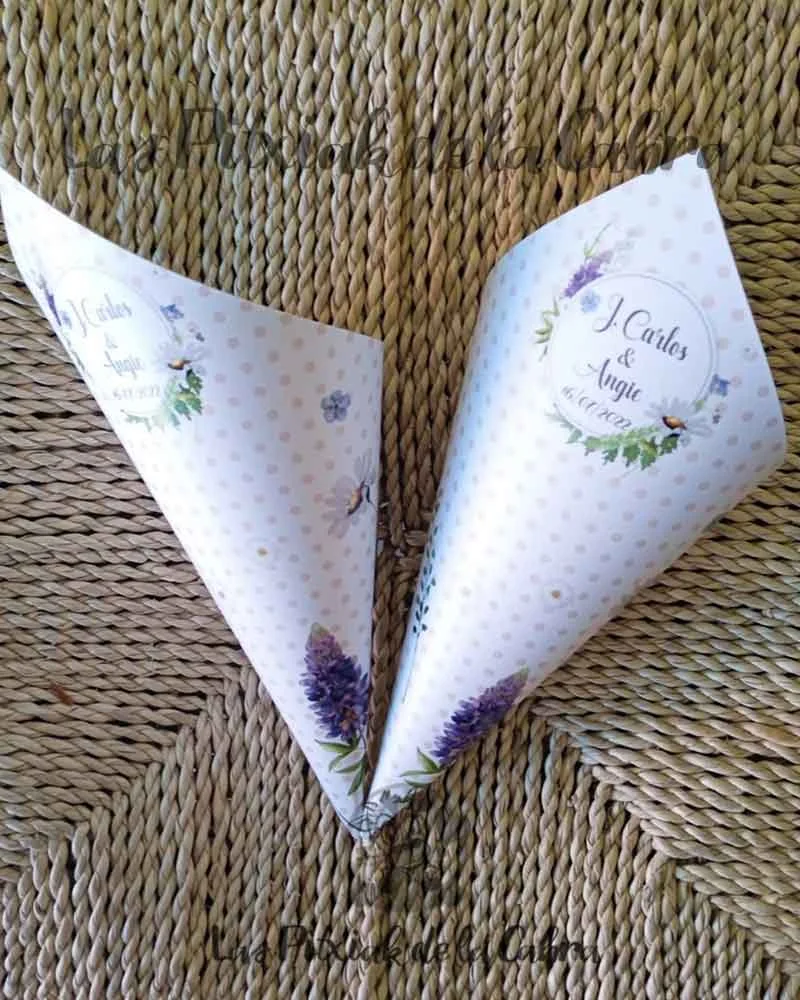Los conos para pétalos son conos grandes de aproximadamente unos 20 cm. y van impresos en papel de 300 gramos a una sola cara. Los enviamos completamente montados, listos para colocar donde queráis ponerlos. Los conos son ideales para llenar de pétalos para tirar en la ceremonia, pero también podéis llenarlos de confeti, arroz o para pueden valer para vuestra mesa dulce.