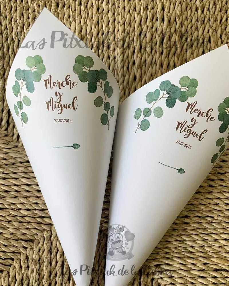 Los conos para pétalos son conos grandes de aproximadamente unos 20 cm. y van impresos en papel de 300 gramos. Los enviamos completamente montados, listos para colocar donde queráis ponerlos. Los conos son ideales para llenar de pétalos para tirar en la ceremonia, pero también podéis llenarlos de confeti, arroz o para pueden valer para vuestra mesa dulce.
