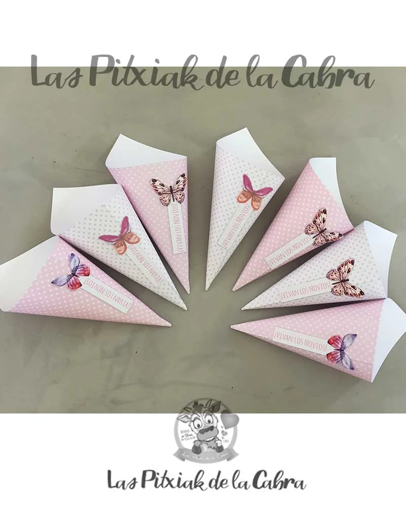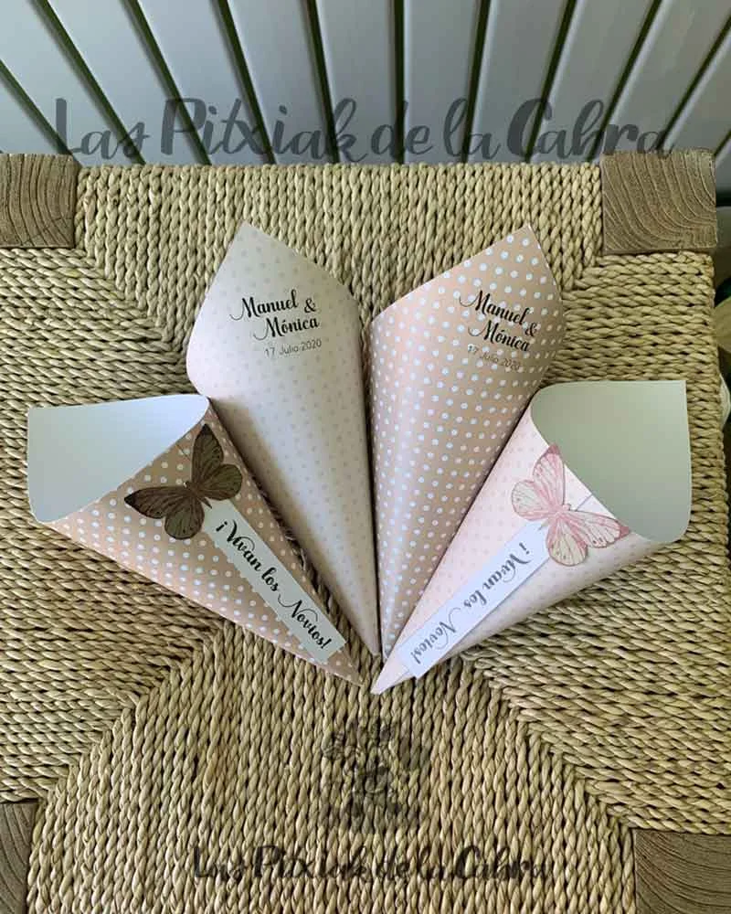 Los conos van impresos a una sola cara, podéis elegir si queréis el estampado en el exterior o en el interior y en este diseño de Conos Nata y Fresa con Complemento-Mariposas llevan un complemento con forma de mariposa en la parte exterior y el texto “Vivan los novios”