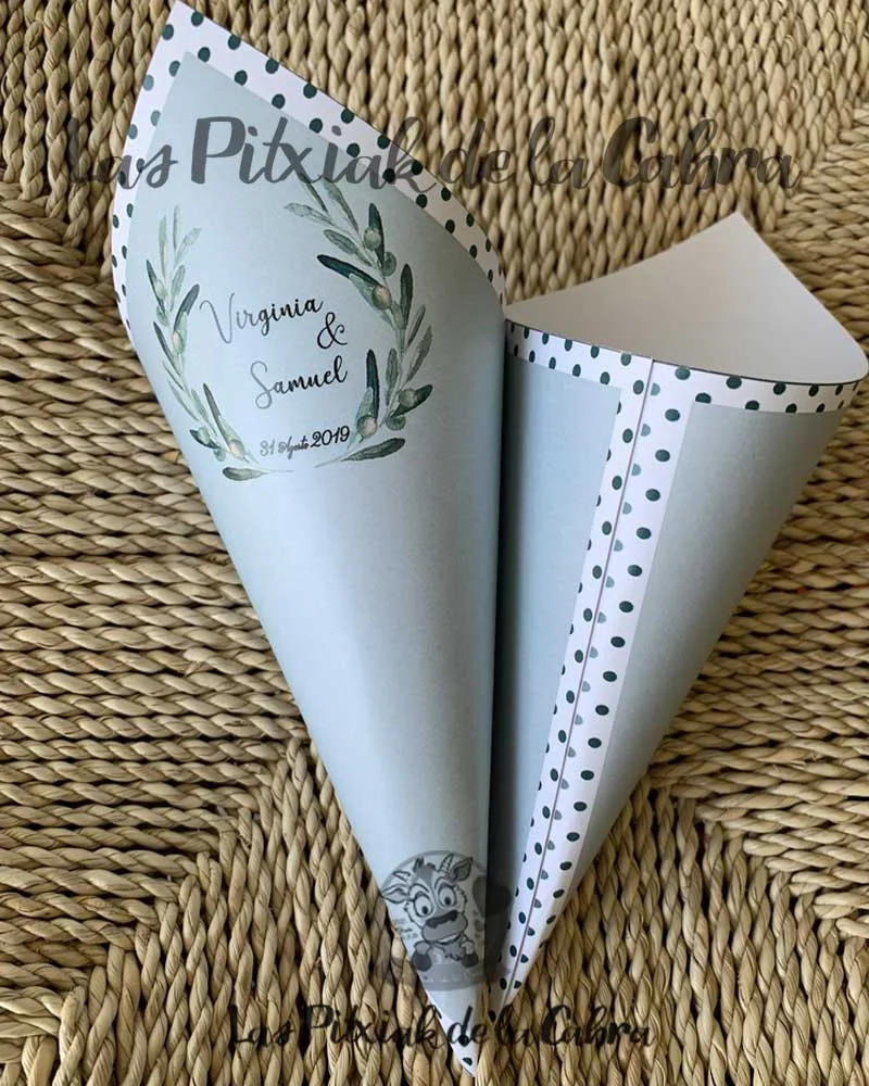 Los conos para pétalos son conos grandes de aproximadamente unos 20 cm. y van impresos en papel de 300 gramos. Los enviamos completamente montados, listos para colocar donde queráis ponerlos. Los conos son ideales para llenar de pétalos para tirar en la ceremonia, pero también podéis llenarlos de confeti, arroz o para pueden valer para vuestra mesa dulce.
