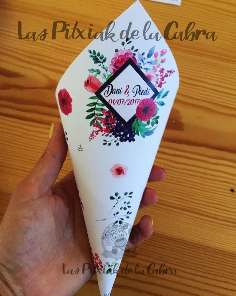 Los conos para pétalos son conos grandes de aproximadamente unos 20 cm. y van impresos en papel de 300 gramos. Los enviamos completamente montados, listos para colocar donde queráis ponerlos. Los conos son ideales para llenar de pétalos para tirar en la ceremonia, pero también podéis llenarlos de confeti, arroz o para vuestra mesa dulce.