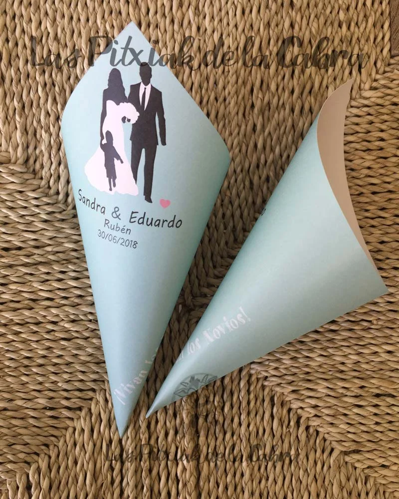Conos Sara & Eduardo, fue el primer diseño que hemos realizado con las siluetas de los novios y de su hijo también nos encargaron las lágrimas de felicidad https://laspitxiakdelacabra.com/producto/lagrimas-sandra-eduardo/