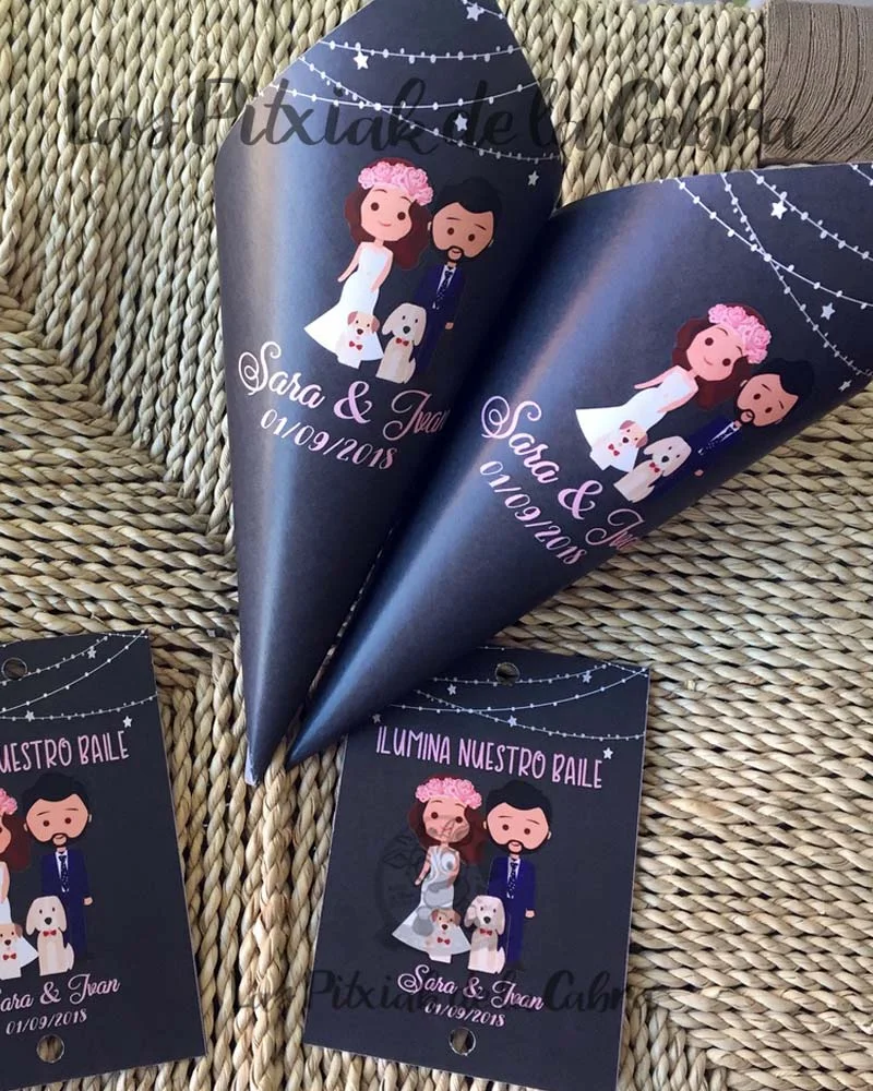 Conos Sara & Iván, fue de los primeros diseños con dibujos de los novios y sus mascotas que nos enviaron fotos con sus vestidos para hacerlo lo más parecido y quedaron genial además pidieron toda la papelería a juego y quedo todo muy original.